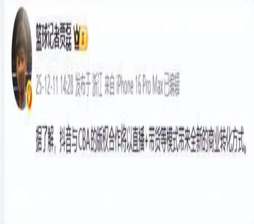 随后,篮球记者贾磊老师给出了最新的报道,他表示,抖音与CBA的版权合作将以直播+带货等模式带来全新的商业转化方式。